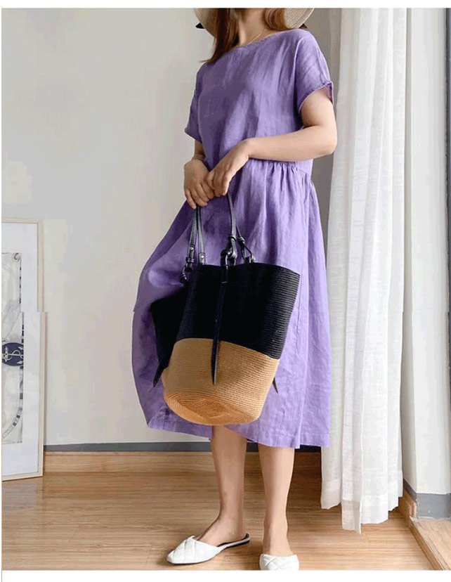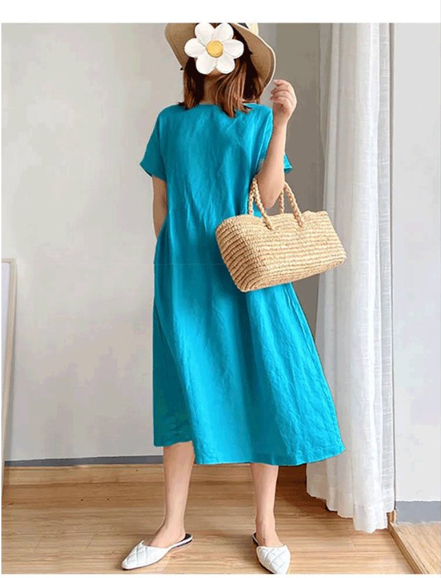 シンプルな無地ワンピース、コットンリネン素材、ナチュラルな風合い、通気&吸湿、ゆったりしたシルエット、体型を選ばず、コーデしやすくて夏にぴったり!